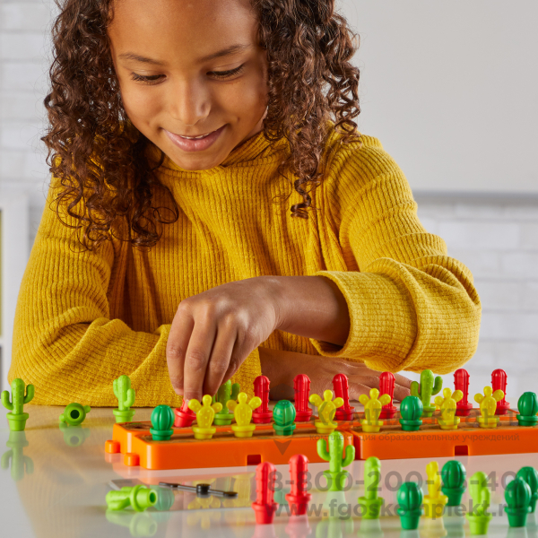 - Затем посадим кактусы в грядки. Для этого выберем карточку с заданием, вставим её в специальное углубление и подберем подходящие фигурки.