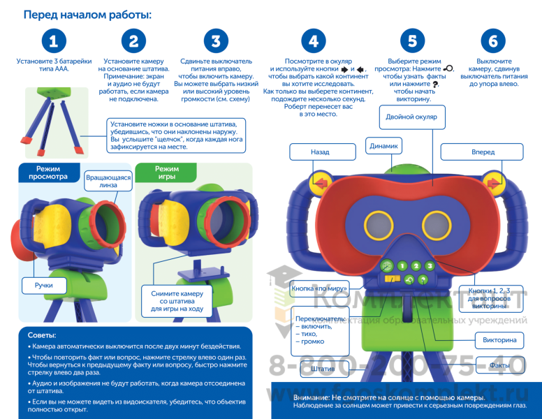 Интерактивная говорящая камера рассказывает юным ученикам интересные факты об окружающем мире. Удобные для детей окуляры позволяют избежать необходимости закрывать один глаз. Идеален для самостоятельного обучения.