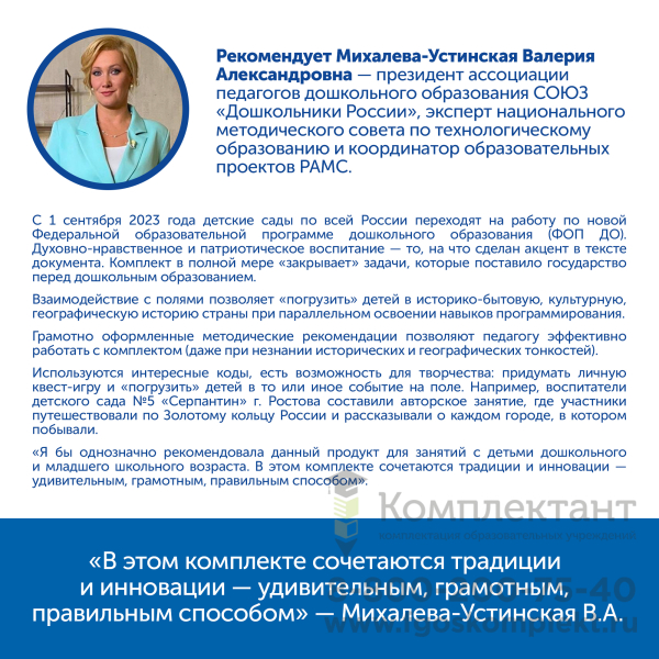 По независимой оценке Михалевой-Устинской Валерии Александровны, президента общественного профессионального сообщества педагогов дошкольного образования СОЮЗ «Дошкольники России», данный комплект:
